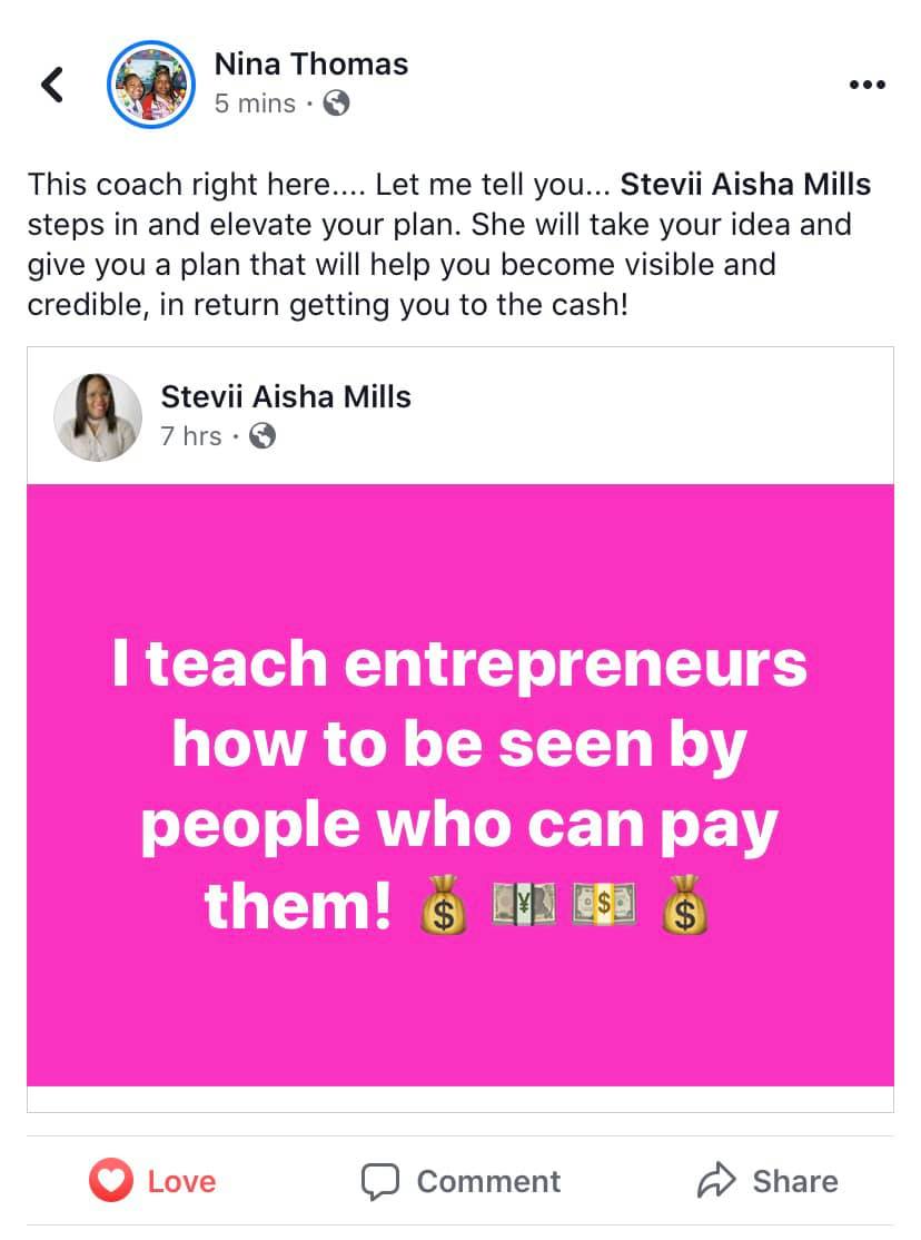 Dr. Stevii Aisha Mills is a Visibility Coach and Strategist, marketing leader, and author of Click To Cash®️. With over 25 years in marketing and public relations and 16 years in entrepreneurship, she made 6 figures in her business in 2020 and 2021, even during a global pandemic. Her work has been featured on BET, CBS, FOX, and ABC, and her podcast airs on iHeart Radio, Pandora, Spotify, and Amazon Music. She believes wealth begins with God-given gifts, and that signed decisions deserve celebration.